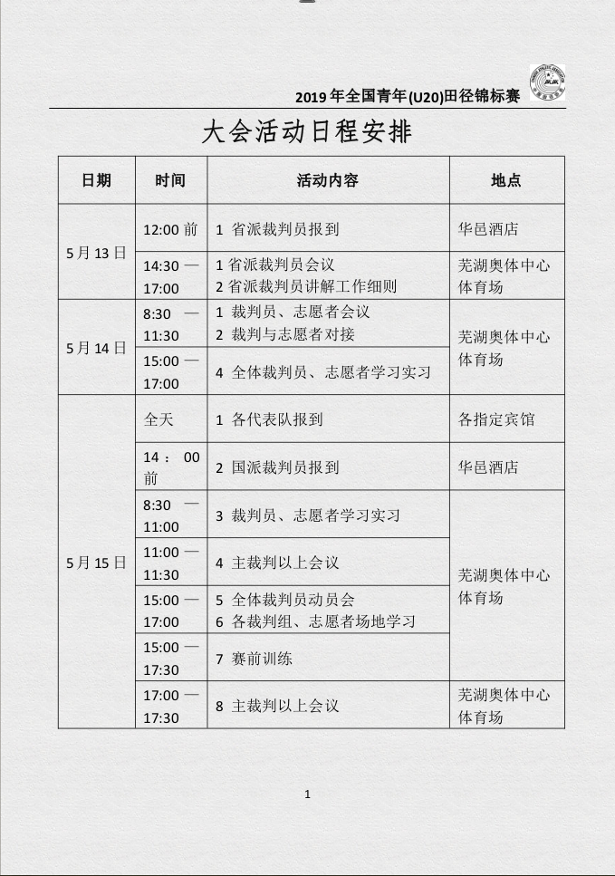 大赛活动日程安排|2019年全国青年(U20)田径锦标赛